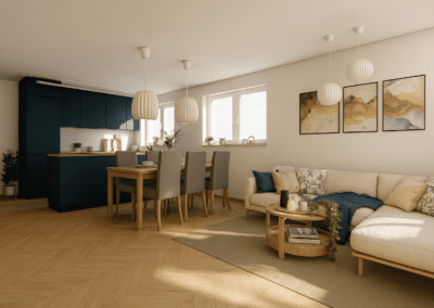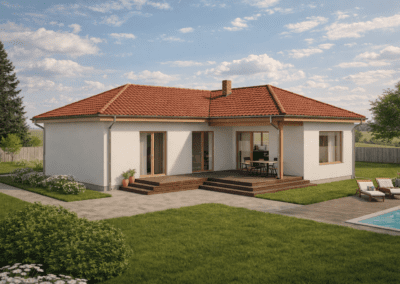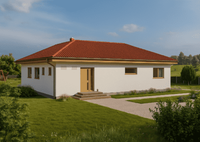 Předností typového Bungalovu M04 je samostatná technická místnost a efektivní chodba, která neubírá plochu ostatním místnostem. Dostatek prostoru zajistí dva neprůchozí pokoje a ložnice. Samotná koncepce domu nabízí ještě větší využití terasy, která je díky půdorysnému uspořádání přístupná z obývacího pokoje. Samozřejmé je dostatečné prosvětlení vnitřních místností, nesporně přispívající k příjemnému užívání.