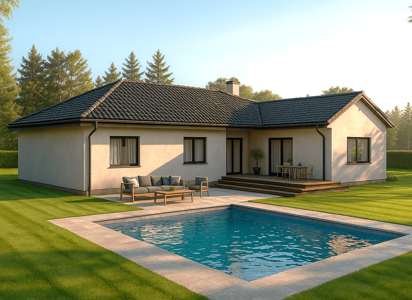 Bungalov XL02  nabízí dostatek prostoru i pro velkou rodinu, jedná se o náš největší typový bungalov. Nechybí pracovna, která může sloužit jako klasický plnohodnotný pokoj. Ložnice je doplněna o vlastní koupelnu. Dům je rozdělen na soukromou a obytnou část, které jsou vzájemně propojeny chodbou s přímým přístupem na krytou terasu.