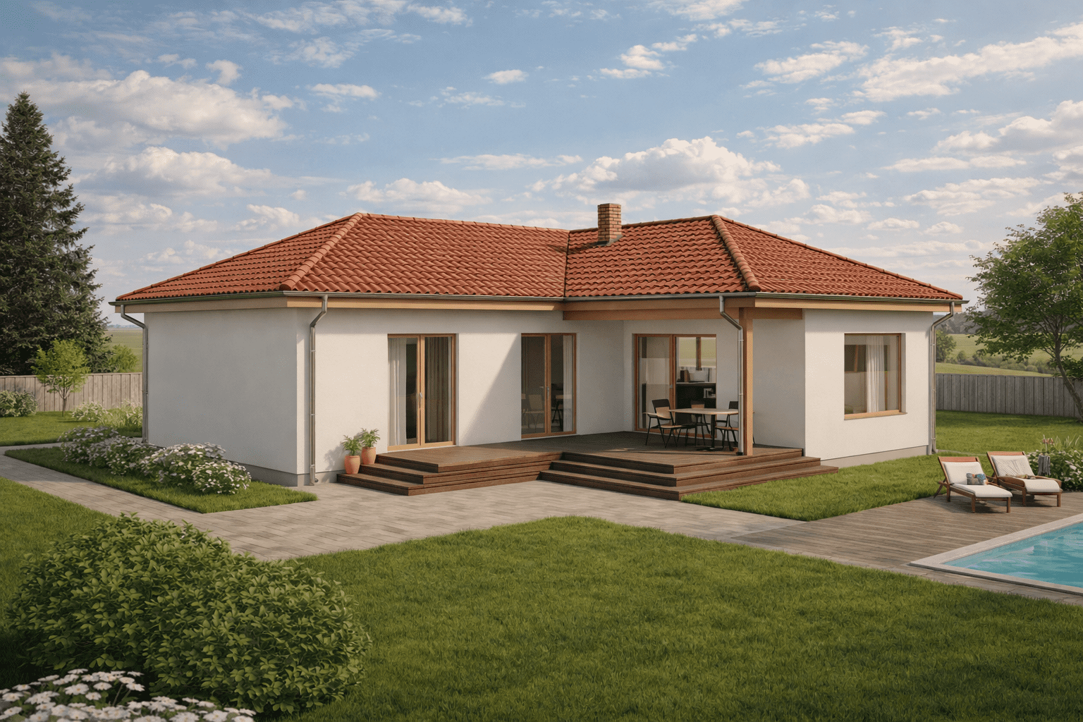 Předností typového Bungalovu M04 je samostatná technická místnost a efektivní chodba, která neubírá plochu ostatním místnostem. Dostatek prostoru zajistí dva neprůchozí pokoje a ložnice. Samotná koncepce domu nabízí ještě větší využití terasy, která je díky půdorysnému uspořádání přístupná z obývacího pokoje. Samozřejmé je dostatečné prosvětlení vnitřních místností, nesporně přispívající k příjemnému užívání.