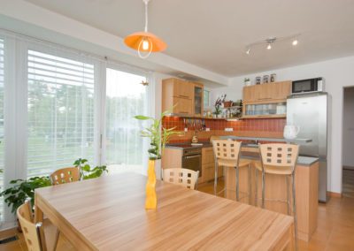 Zastřešení je vytvořené klasickým krovem se sedlovou střechou a pultovým vikýřem. Výrazným prvkem je komín, který probíhá před fasádou. Podlaha terasy je ve stejné výškové úrovní, jako podlaha v interiéru. Díky tomu nenarušuje plynulý průběh z interiéru do exteriéru. Dům je krásně zařízený. Stupeň dokončení byl dům bez interiéru o velikosti 4+kk. Děkujeme majitelce za zaslání fotografií.