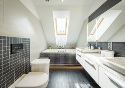 Marie: Šlo o zvyk – zvyknout si na to, že tam člověk nemá takové to své mikroklima a teploučko. Ale vzhledem k tomu, že topí podlahové topení a teplo jde od země, tak je to v pořádku. Je to opravdu o zvyku, protože návštěvy se sprchují raději v koupelně dole, kde se můžou zavřít, ale mně osobně to vyhovuje. A je to pro mě lepší i na údržbu, není potřeba čistit všechny spáry a podobně.