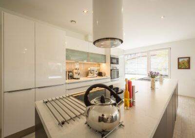 Ondřej: Digestoř v domě znamená díru do obálky domu, kterou se snažíte co nejlépe utěsnit. To je v pasivním domě problém. Proto je digestoř jen cirkulační. Původně jsme tady měli mít normální, ale nebylo mi doporučeno dělat další prostup do konstrukce, protože by kolem toho byla spousta tepelných mostů a složitých konstrukčních detailů. V cirkulační digestoři jsou filtry. Nasaje vzduch, pročistí ho a vrchem zase fouká ven. A slouží nám hlavně kvůli světlu nad varnou deskou. Mám nastaveno, že když na digestoři rozsvítím světlo, tak se na vysoký výkon pustí vzduchotechnika, aby to více větralo.