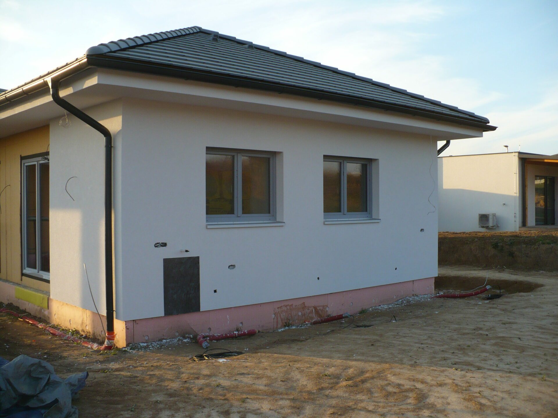 Dům s půdorysem do tvaru písmene L je individuálním projektem dle přání klientů. Dispozice 4kk je ideální řešení pro čtyřčlennou rodinu. Realizace je včetně základové desky a stavba bude předána klientovi ve stupni dokončení dům bez interiéru.